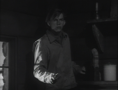 It's a fast turn-around, but Lupino has enough effect to make it plausible, if still improbable. But Ray never lets the film flag, and his handling of Danny is dark and precisely executed. He introduces the deranged lad through the knife he used to kill the girl, the steel of the blade glinting in the dark cellar where he hides, blindly brandished at the beckoning sister who stands at the top of the cellar surrounded by sky and light like the Holy Mother for whom her name derives. Later, when Jim chases the man to an abandoned shack, Danny backs toward a window that casts his knife arm in light while leaving the rest of him darker. A shot of Jim appraising the situation in the middle ground keeps Danny's knife arm in the foreground. Finally, Ray cuts to an extreme close-up of the knife as he threatens Jim, Danny's entire being focused into the weapon until it becomes his visual representation.