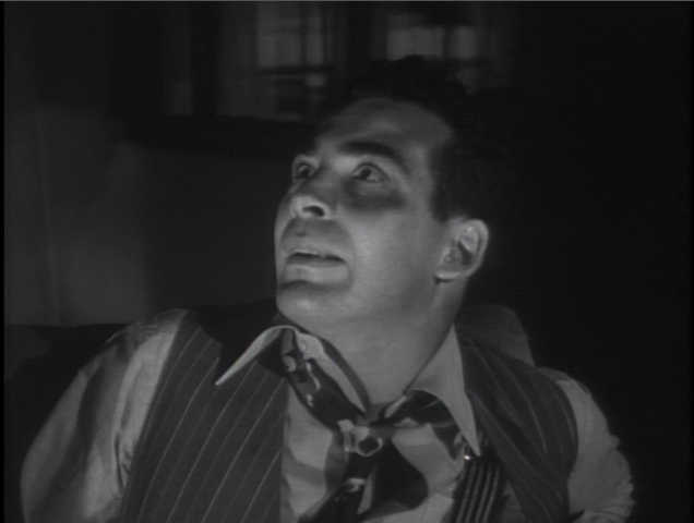 The film takes another turn when Jim and Walter, separated from the rest, approach a lonely house on a hill where a lone light soon extinguishes itself. Convinced the killer has hidden here, they storm up the door and beat on the door, only for a blind woman, Mary (Ida Lupino), to answer. Lupino's face carries concern, worry, blank innocence but also awareness and intelligence. To look at her is to know at once that she's covering for someone but to also know that she means no harm and does not wish to deceive anyone for any reason other than to protect her brother. She instantly throws off the balance of the film, and Ryan blanches when confronted with her, his bitterness and rage momentarily set aside. Ray's framing of the men's search of the house casts them as intruders, their shadows dancing along the walls as Mary sits in a chair looking blankly ahead.