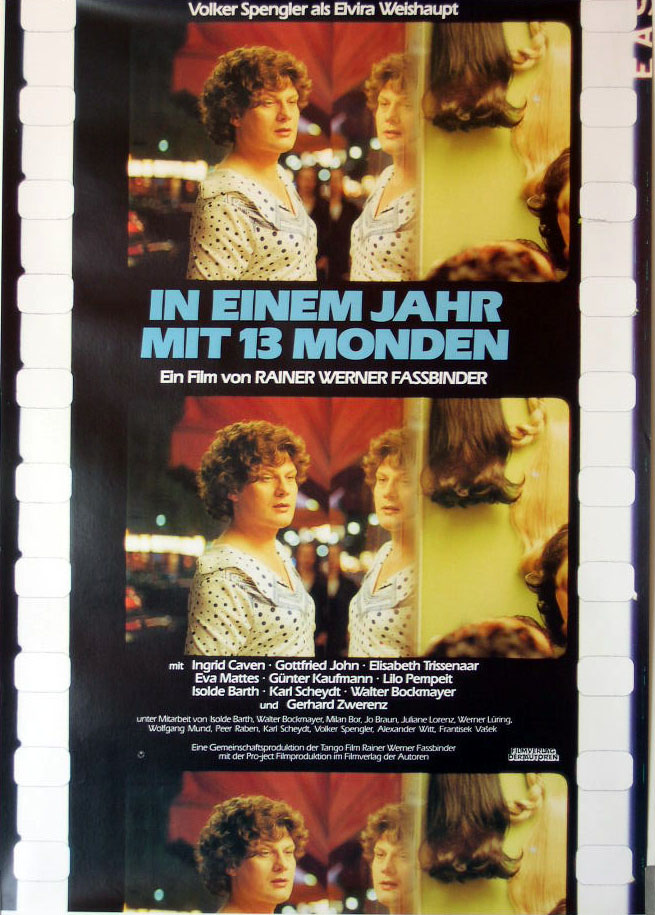 In terms of density of ideas, richness of tragedy and excess of style, In a Year of 13 Moons feels like a summation of Fassbinder's skill, a distillation of his politics, grim humanism, even his controversy-baiting. This two-hour tour through contemporary Germany is quite possibly more harrowing than the director's 16-hour overview of a Weimar Germany on the brink of fascism. I admit I was unsure about Fassbinder's use of transgender as an extreme example of the usual visualization of sexual ambiguity in movies, as a means of communicating not a genuine self-identity but a host of other problems, and to say that it deals with more universal feelings of self and belonging may not wholly excuse its use of the theme. Yet as a means of coming to terms with a lover's suicide and of perhaps getting out Fassbinder's own pansexual uncertainty, In a Year of 13 Moons infuses its savage tragedy and black humor with honesty. Nowhere is the film's essence of simultaneous searching for and fear of self-realization than in a scrawled note in an apartment that forebodingly reads, "But my greatest fear is that, one day, I'll find words to express my feelings. For when I do..."